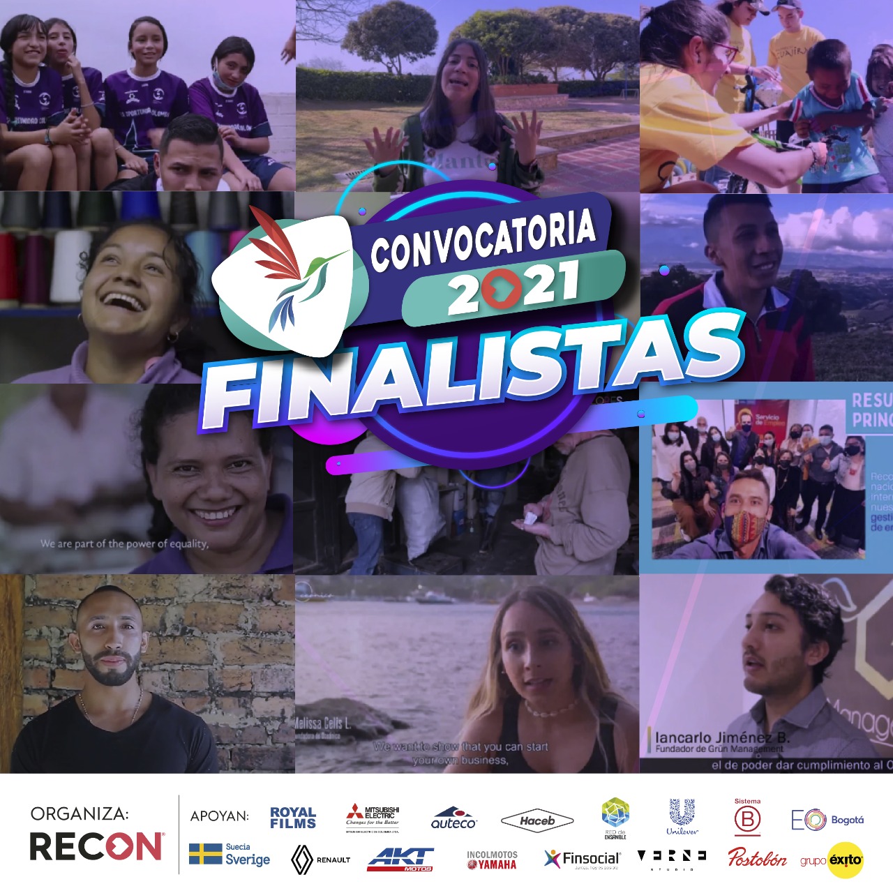 La convocatoria RECON 2021 se lleva a cabo gracias al apoyo de nuestros aliados Suecia, Unilever, Postobón, Grupo Éxito, Entrepreneurs’ Organization, Sistema B, Royal Films, Finsocial, Verne Studios y la Red de Ensamble conformada por Renault, Mitsubishi Electric de Colombia, AKT Motos, Auteco, Yamaha y Haceb.
